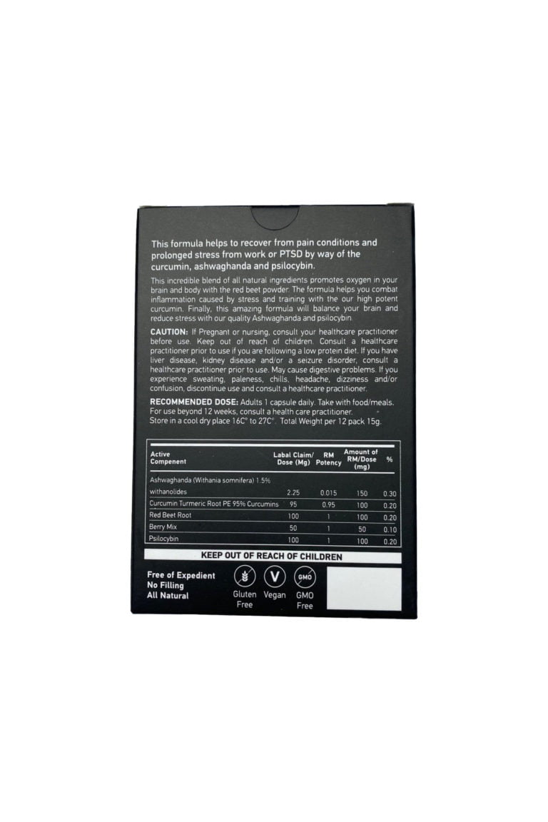 This formula helps to recover from pain conditions and prolonged stress from work or PTSD by way of curcumin, ashwagandha, and psilocybin.